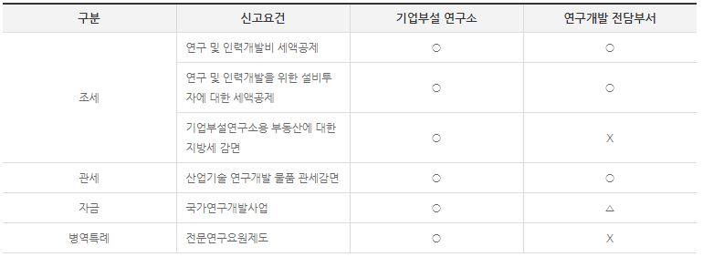 기업부설연구소 및 연구개발전담부서(이하: 기업부설연구소 등)의 설립주체는 법인사업자, 개인사업자로써, 영리 목적으로 운영하는 기관을 대상으로 한다. 기업부설연구소 등은 기업내에서 연구개발활동 만을 전담하는 조직임으로 연구개발이외의 사업활동(영업, 생산, 관리)에 최소한 필요한 인력, 시설 등을 보유하여야 한다