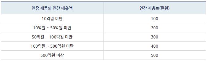 – 신청 수수료는 인증 신청 시 납부하고, 사용료는 신규인증 또는 재약정 시 납부