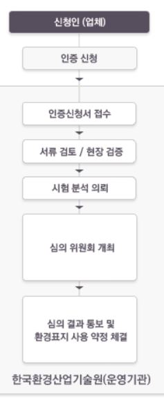 인증신청- 환경표지제도 홈페이지에서 인증신청이 가능한 제품인지 즉 “환경표지 대상제품” 에 적용되는지 확인 후 다음 서류들을 작성 및 첨부하여 한국환경산업기술원에 온라인으로 제출함.- 사업자등록증 사본 1부